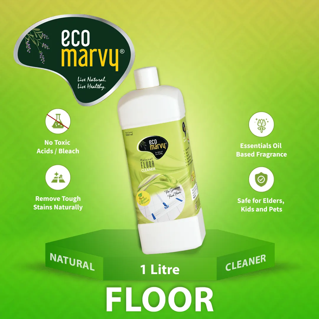 - EcoMarvy has introduced a 1 Litre Natural Floor Cleaning Liquid, the formulation with natural ingredients, a ready-to-use spray to remove deep specks of dirt & stains. Ecomarvy has the best innovative liquid for floor tiles in India, containing only natural ingredients & zero chemical agents, efficient with a wonderful natural smell, no toxic fumes & highly safe for skin & lungs on a daily usage, leaving no toxic footprint on the environment.
