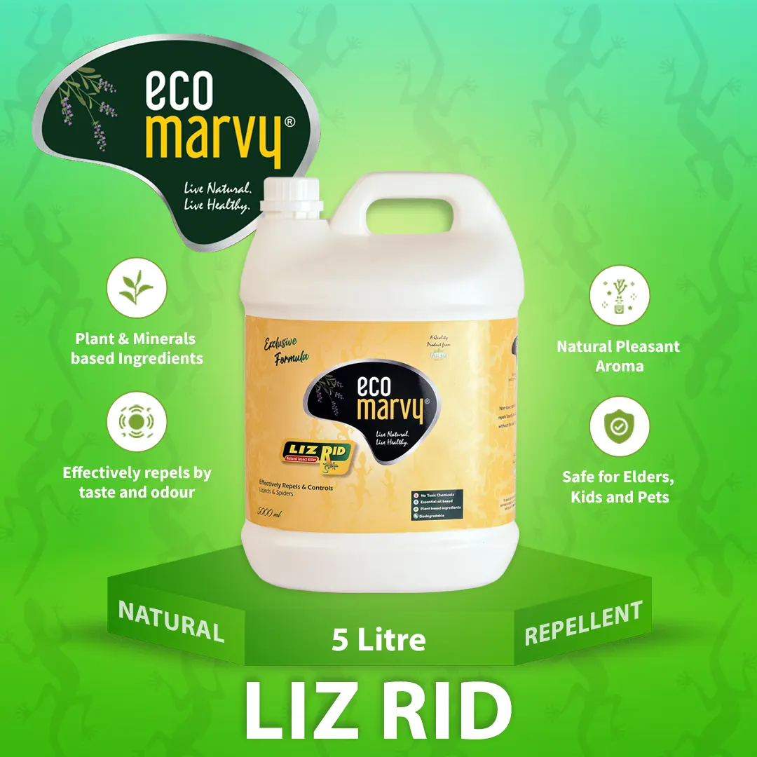 EcoMarvy has introduced a 5 Litre Best Lizard Repellent called LIZ RID, the formulation with natural ingredients, a ready-to-use spray to eradicate the disruption caused by lizards. As it is the Natural lizard repellent & anti-lizard spray in India and contains only natural ingredients & zero chemical agents, efficient for gardens, agriculture fields & plot areas.
