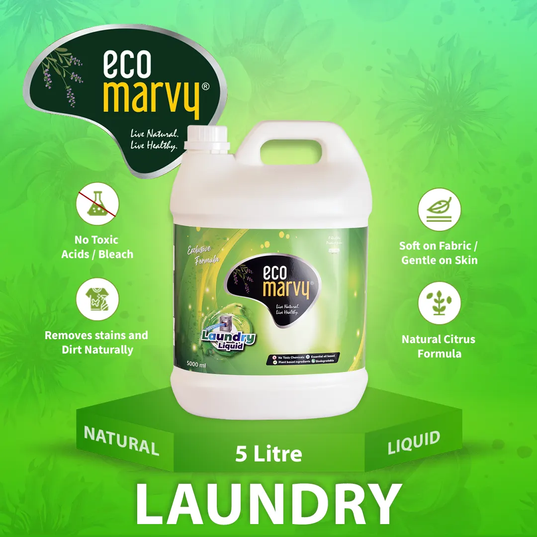 - EcoMarvy has introduced a 5 Litre Natural Washing Detergent Liquid with natural ingredients, a ready-to-use liquid to remove deep specks of dirt & stains in the clothes. Ecomarvy has the best detergent for washing in India, containing only natural ingredients & zero chemical agents, efficient with a wonderful natural smell, no toxic fumes & highly safe for skin & lungs on a daily usage, leaving no toxic footprint on the environment.